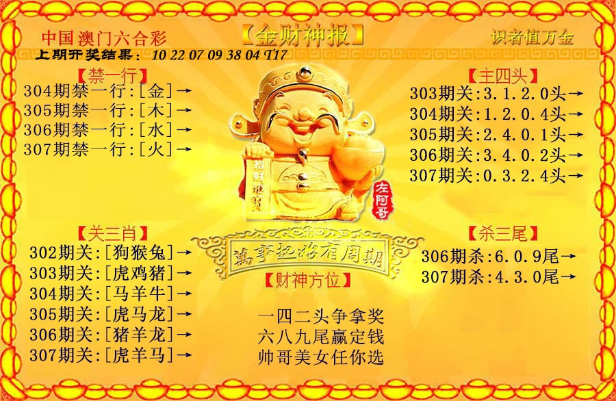 | 307期 | 猴马兔鸡猪鼠 | 开:?00中 |